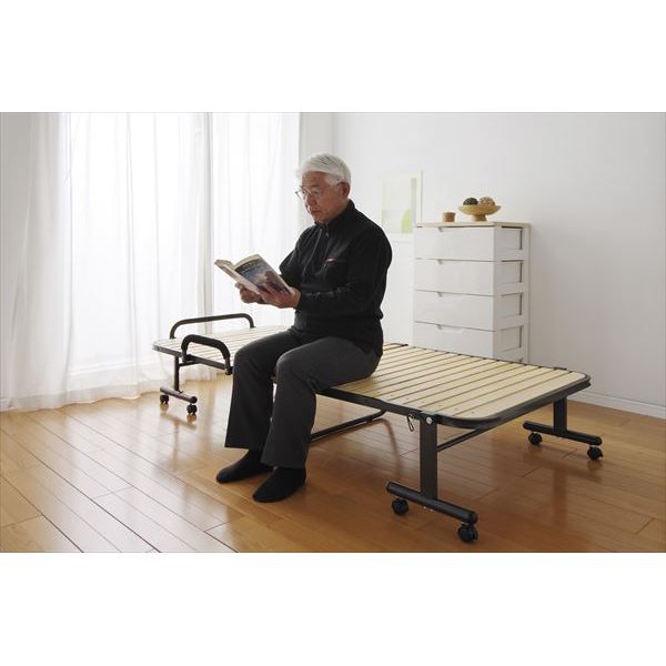 ・【商品詳細】●本体サイズ(約):幅98×奥行203.5×高さ45cm ●すのこ面サイズ(約):幅90×奥行200cm ●折りたたみ時サイズ(約):幅98×奥行36×高さ116cm ●重量(約):23.4kg ●耐荷重:約90kg ※マットレスや敷き布団を敷いてご使用ください。