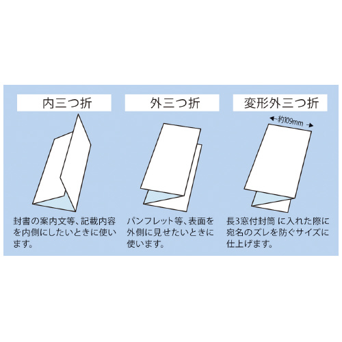 ●サイズ/W470(使用時W570)×D365×H300mm●質量/約19.5kg●適合用紙サイズ/A4用紙●適合用紙厚/55~110kg(64g/平方メートル~127.9g/平方メートル)●適合用紙種/上質紙・再生紙※アート紙やコート紙では正常に折れない場合があります●処理速度/88枚/分(上質紙・64/平方メートル内三つ折時)●排紙方式/自然落下方式●折り種類/内三つ折・外三つ折・変形外三つ折●重ね折り枚数/3枚まで(上質紙・64g/平方メートル/使用時)※手差し給紙●電源/AC100V●消費電力/63W●給紙積載量/最大300枚●枚数カウンター/4桁加減算 オートリピート