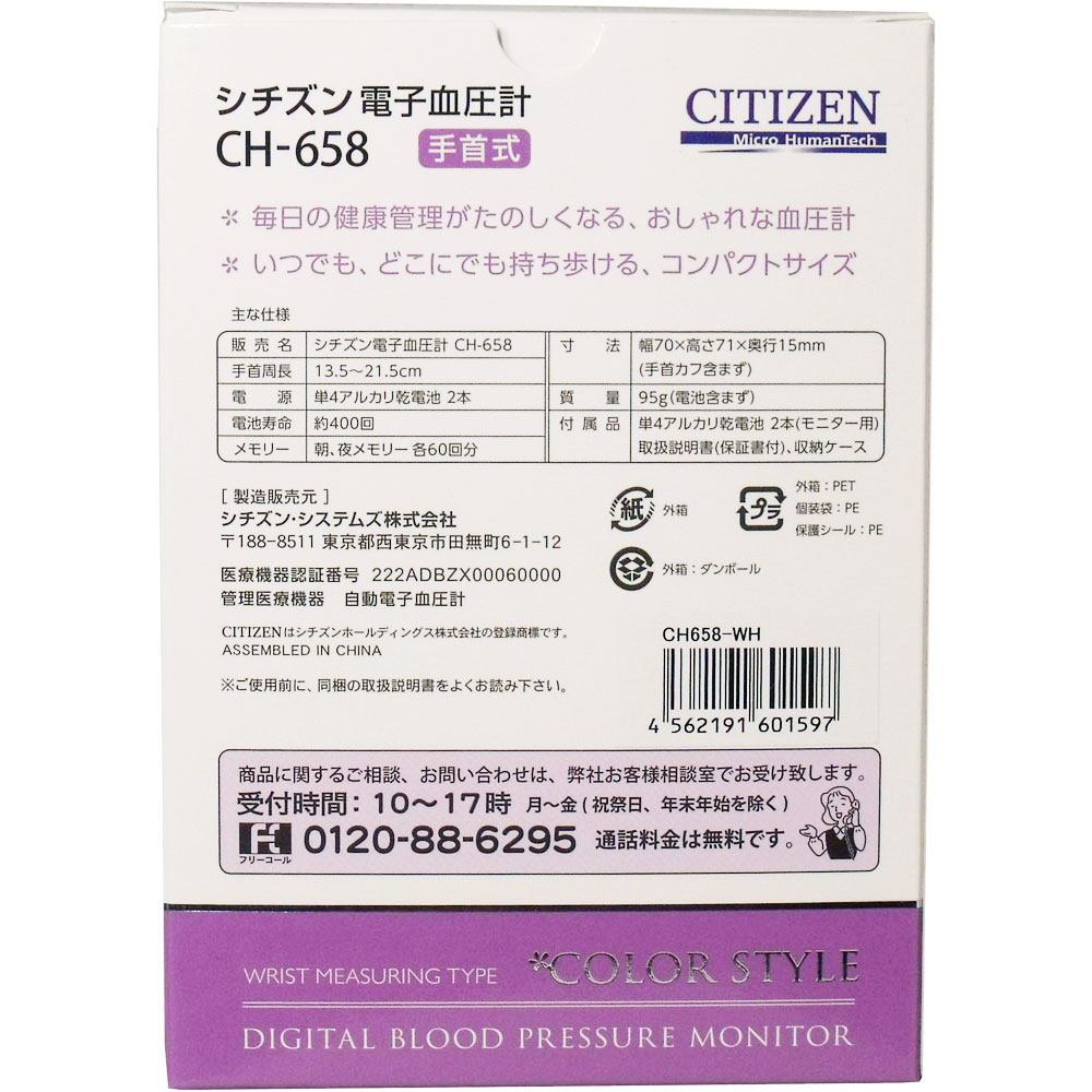 【仕様】測定方式・・・オシロメトリック法カフ・・・ソフトカフ手首周長・・・13.5~21.5cm表示方式・・・デジタル表示測定範囲・・・圧力0~280mmHg、目量1mmHg、脈拍40~180拍/分測定精度・・・圧力 ±3mmHg、脈拍数±5%加圧・・・ポンプによる自動加圧減圧・・・電磁弁による自動排気定格および電源・・・DC3V、単4アルカリ乾電池2本電池寿命・・・約400回(1日2回、室温22度、180mmHg加圧で測定の場合)メモリー・・・朝、夜メモリー各60回分質量・・・約90g(電池含まず)寸法・・・約70(幅)X71(高さ)X15(奥行き)mm(手首カフ含まず)使用環境温湿度・・・10~40度、30~85%保管環境温湿度・・・-20~60度、10~95%付属品・・・取扱説明書(保証書付)、モニター用電池、収納ケース