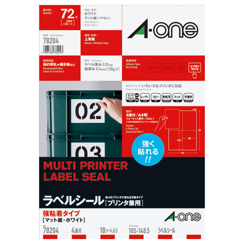 プリンタ兼用ラベルシール 強粘着タイプ 4面 18枚