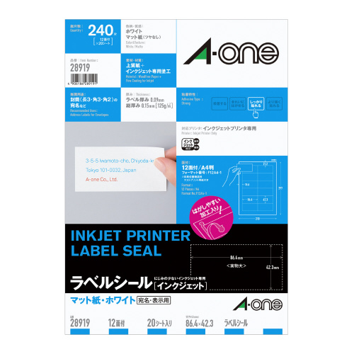 インクジェット用ラベルシール マット紙 12面四辺余白付 20枚