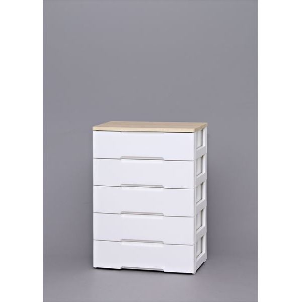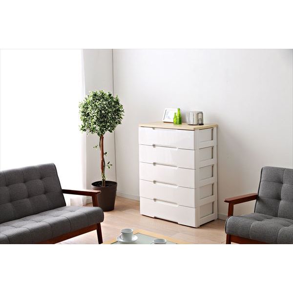 商品の説明サイズ:2)幅56cm?|?スタイル:B.5段単品?|?カラー:ホワイト/天板ナチュラルリビングの収納にピッタリの木天板付きチェストです。木天板は汚れに強く、前板は塗装家具のような質感でおしゃれなデザインです。また、引出しには開閉がスムーズな金属レールを採用しました。Yシャツを2枚並べて収納できる幅56cmタイプです。※完成品でお届けします。※上段を下段に重ねる作業のみ必要です。