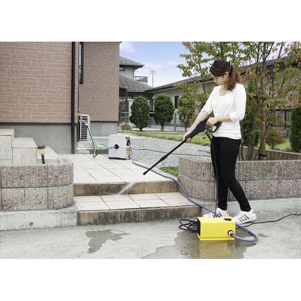 商品の説明近くに水道(蛇口)がなくても使える、高圧洗浄機です。ガンコな汚れを高圧水流で吹き飛ばして掃除できます。洗車や玄関周り、ベランダなどの掃除に適しています。