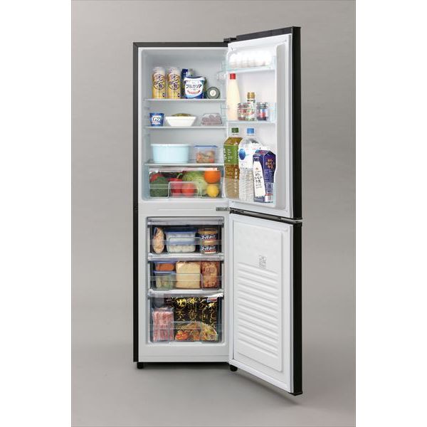 商品の説明スタイル:2)162L(ブラック)?|?パターン(種類):1)冷蔵庫(単品)シンプルながらも洗練されたデザイン。お部屋に馴染む、奥行53.5cm。見た目はスッキリ、庫内は広々。冷蔵室100L、冷凍室62Lと大容量! 冷蔵室は小物・ボトルポケットやクリアケースがついているので、使いやすくなっています。冷凍室は大容量62Lのボトムフリーザータイプ。冷凍食品がたくさん入り、共働き家庭や単身赴任の方にもおすすめです。また、引き出し付きで霜が付きにくく、冷凍焼けもしにくいので、長期保存に向いています。【ボトムフリーザー】中が見えて取り出しやすい、透明引出し付き。高さの異なる引出しに、サイズ別に食品を整理が可能。必要な引出しだけを開けるため、冷気が逃げにくく、霜も付きにくい。【冷蔵室】高さを変えられるガラス棚3枚。小物から2Lペットボトルまで、すっきりしまえる3段ドアポケット。野菜もたっぷり入るフリーケース。静音設計の28dbなので生活空間に置いても音が気にならないほど静か。庫内灯・温度調節つまみ付き。省エネ基準達成率101%。※目標年度2021年度※設置時のご注意・本製品は右開きです。・右側はドアが開くようにスペースを5cm以上取ってください。・右側に壁がある場合は31cm以上空けてください。スペースがないと、お手入れ時に棚が取り出せません。●種類ノンフロン冷凍冷蔵庫●冷媒R600a●ドア数2●商品サイズ(cm)外寸:幅約47.4×奥行約53.5×高さ約149.6●質量約40kg●定格電圧(定格周波数)AC100V(50Hz/60Hz)●定格内容積※1全体:162L冷蔵室:100L冷凍庫:62L●冷凍室の性能※2記号:フォースター冷凍負荷温度(食品温度):18℃以下冷凍食品の保存期間の目安:約3か月●定格入力(50Hz/60Hz)68/74W●電熱装置の入力6W●ドア開閉方向右●コード長1.8m※1定格内容積は、日本工業規格(JISC9801:2015)にもとづき、食品収納スペースと冷気循環スペースを含んでいます。※2冷凍室の性能は日本工業規格(JISC9607)にもとづき表示しています。※商品の仕様は予告なく変更することがあります。