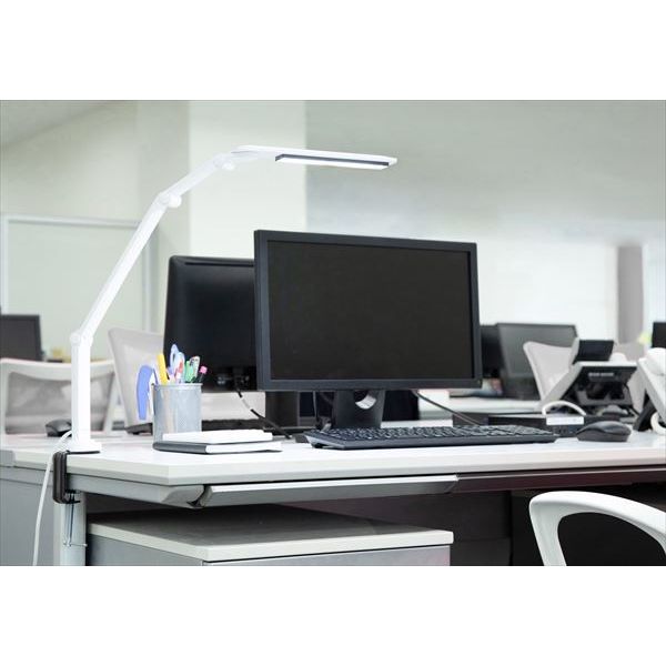 商品の説明スタイル:7)ハイエンドモデル(クリップ型)「まぶしさガード」採用で、手元は明るく、光源はまぶしくない、目にやさしいLEDデスクライトです。明るさは無段階調節で調光ができ、オフィスなどで適切な明るさをご提供します。デスクトップパソコンのサイズに合わせた高さで使用できます。クランプタイプで、取り付ける際に薄型なのでデスク上で場所をとりません。◆明るさ調光◆まぶしさガード◆タッチ式スイッチ※組み立て式●商品サイズ(cm)幅約27.0×奥行約41.0×高さ約37.0●質量約650g●主要材質ポリカーボネート●使用光源LED●適合規格照度:JIS照度 AA形準拠●定格電源電圧AC100V(50/60Hz)●定格消費電力(明るさ最大点灯時)12.0 W●待機時消費電力0.5W●照度3000lx●調光無段階●光色昼白色(5000K)●演色Ra85●電源コードの長さ1.8m●日本国内専用