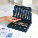 ●硬貨を1枚ずつ取り出せるスタンド式の簡易レジです。コインカウンター付で積み重ねた硬貨の金額が確認できます。コインカウンターの下は、紙幣を収納しておけるスペースを完備。紙押さえもしっかりついているため、屋外での使用も安心です。また、フリースペースもあるので、お会計の際、硬貨を一時的に置くことも可能です。 ●サイズ/W203.5×D159×H54.5mm ●コイン収容枚数/各金種50枚 ●材質/ABS ●コインカウンター付 ●開いたときの高さ/180mm ●コンパクトに折りたたみ可能