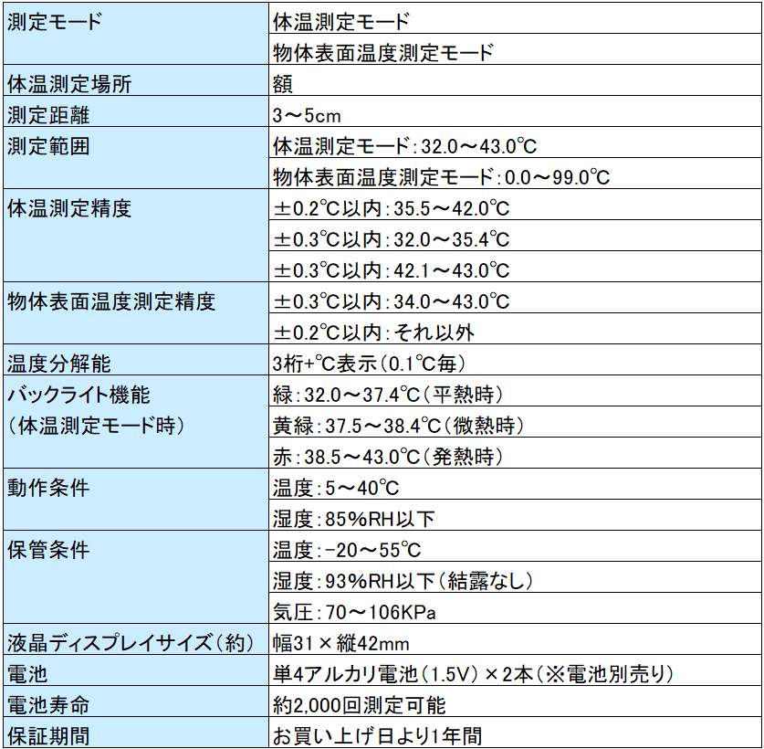 わずか1秒の短時間測定で、触れずにすばやく測れるスティックタイプの体温計です。体温測定モード時にはバックモニターの色が、緑(平熱時)・黄緑(微熱時)・赤(発熱時)の3色でお知らせします。体温測定と物体表面温度測定の選べる2つのモードで、体温だけでなく、赤ちゃんのミルクや食事などの温度測定にも便利です。自動電源オフ機能搭載で、30秒間操作を行わない場合自動で消えます。32回分の測定結果を記録することができます。電池は別売りとなります。