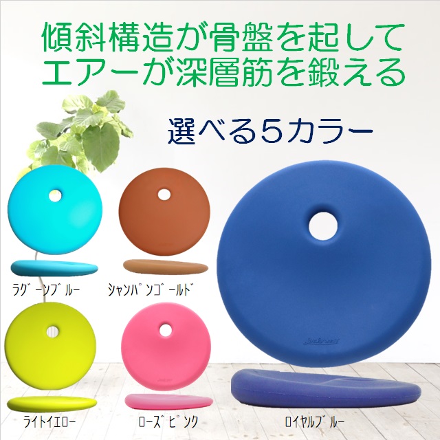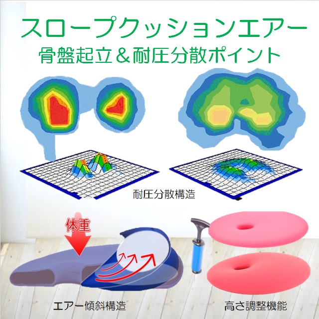 今まで発売されている椅子上の矯正椅子やマットの多くが使用しているときだけの「骨盤矯正」や「体圧分散」や「姿勢を矯正」などが殆どで、根本的な悩み解決は図られていません。その理由は歪んだ骨格が座っているときだけ正しい位置に戻ったとしても周囲の歪んでガチガチ筋力はそのままでは骨格歪矯正されません。必ず周囲筋の柔軟性づくりが大切で「動かして解して正しく戻す」の実行が必要です。椅子に置いて使用できる「スロープクッションエア」は、傾斜構造で骨盤を起こしエアーがインナーマッスルを鍛えます。「ながら運動」で体の骨格と筋力を解し、バランスの良い体づくりをサポートしてくれます。独自開発の「スロープエアークッション」はオフィスでもお家でも腰・骨盤を優しく包みます。中が空気なのでお一人お一人の腰の形状にフィットした心地よい厚さに調節可能。インナーマッスルの微細な運動も促し、腰や背骨を正しく戻す筋肉をつくる手助けをします。長時間座りっぱなしの人や腰の悩みや姿勢が気になる方におすすめです。