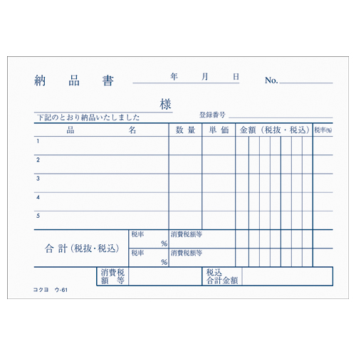 複写簿(カーボン紙必要) 納品書 B7横 5行 50組 ウ-61N