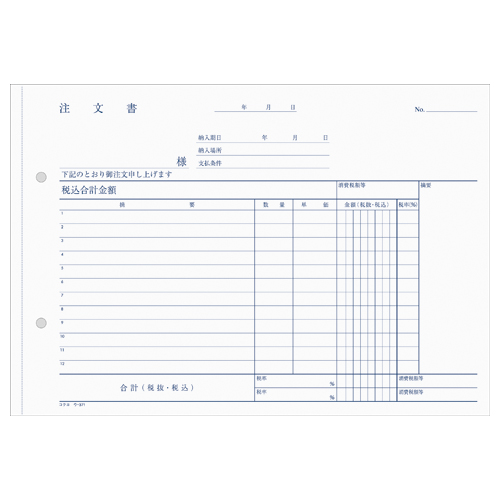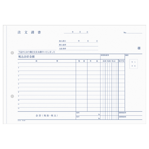 NC複写簿 3枚注文書(注文請書付) B5横 2穴80mmピッチ12行 40組 ウ-371