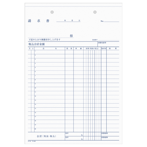 NC複写簿 請求書 B5縦 2穴80mmピッチ20行 40組 ウ-302