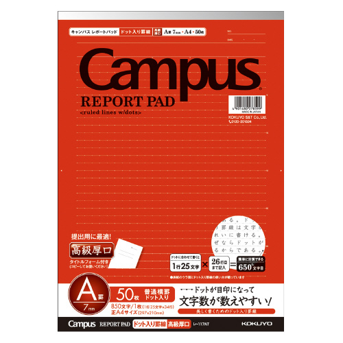 キャンパスレポートパッド(ドット罫) A4 罫幅7mm34行50枚(高級厚口) レ-117AT