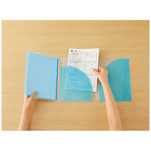●2つのポケットで配布プリントを教科別・目的別に分類することができ、プリントの端の折れや破れも防ぎます