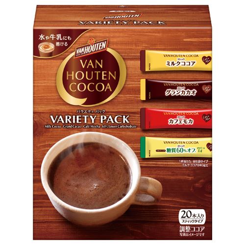 ●ミルクココア:芳醇カカオとまろやかミルク。グランカカオ:カカオ際立つ濃厚な味わい。カフェモカ:濃厚ココア×本格コーヒー。糖質オフ:おいしさそのまま糖質オフ(1杯あたり、当社袋タイプミルクココア240g比)。※メーカー都合により、アソート内容が2020年03月以降順次変更になります。(カロリー1/4→糖質60%オフ)