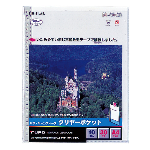 ●A4タテ ●外寸法/302×229mm ●ポケット仕様/エンボス仕上げ・中紙あり ●ポケット内寸/298×212mm ●シート厚み/0.06mm ●中紙色/グレー ●材質/再生PP ●入数/10枚 *とじ穴部分のテープ補強と底部ローレット加工による耐久性の高いリーンフォースポケット ●30穴(2穴・4穴)対応