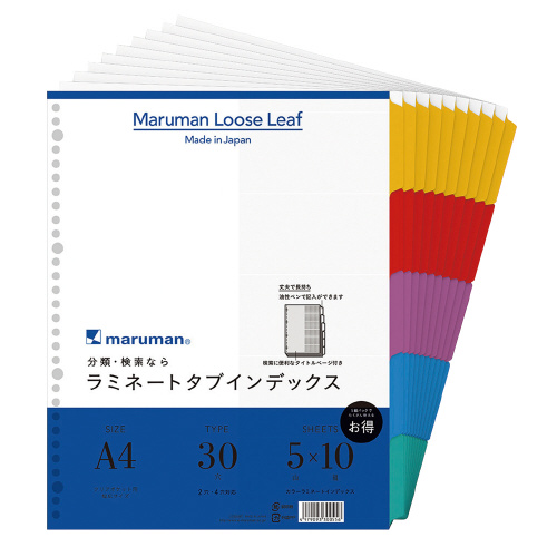 ●A4タテ ●サイズ/297×232(+9.5)mm ※( )内は山高さ ●1組/5山:5色5山見出し+扉紙 ●穴数/30穴 ●10組入 ●古紙パルプ配合