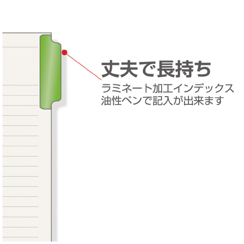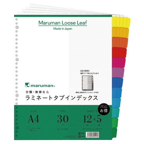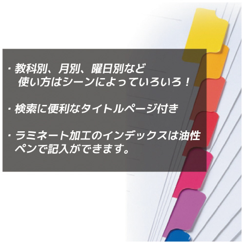 ●A4タテ ●サイズ/297×232(+9.5)mm ※( )内は山高さ ●1組/12山:12色12山見出し+扉紙 ●穴数/30穴 ●5組入 ●古紙パルプ配合