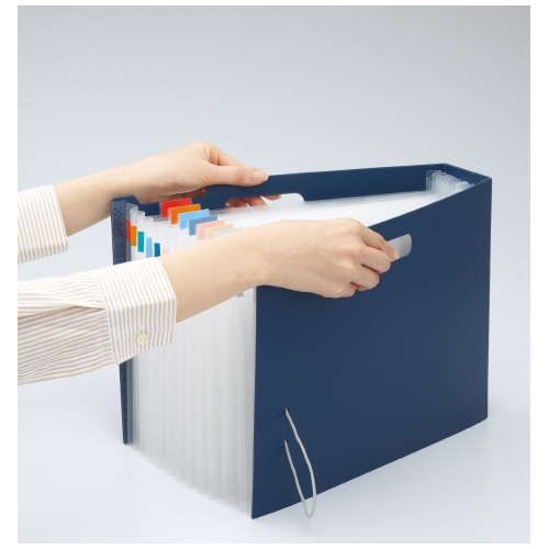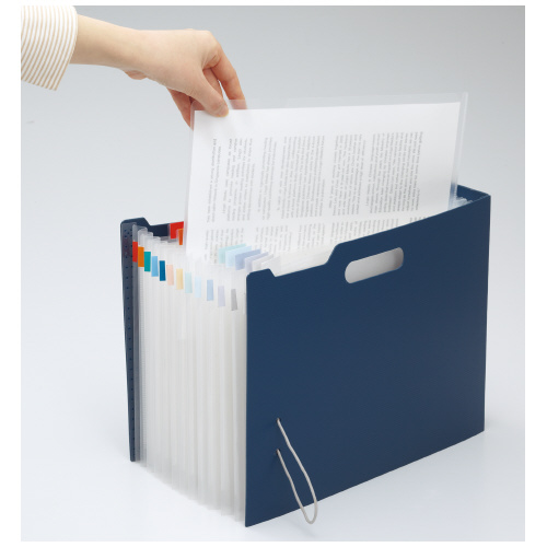 ●分類・検索性に優れたジャバラタイプのボックスファイル。卓上では大きく広げて使え、しまう時はスッキリ収納