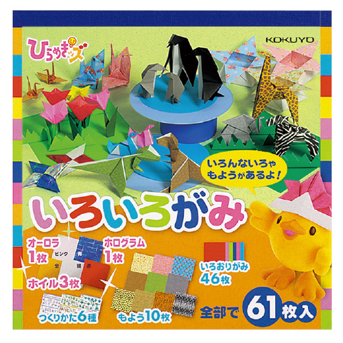 ●サイズ/150×150mm ●楽しい柄入りの、ブックタイプの折り紙 ●バラエティ豊富な61枚入り。オーロラやホログラムなど子供に人気のキラキラ・ピカピカの折り紙や動物柄などが印刷された模様の折り紙です ●セット内容/いろおりがみ46枚、オーロラ1枚、ホログラム1枚、ホイル3枚、模様10枚 ●つくりかた6種 ●ばらけにくく、1枚ずつきれいにはがせるブックタイプ