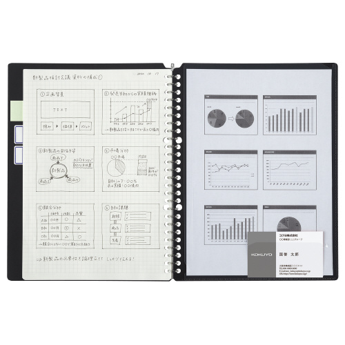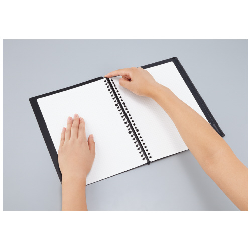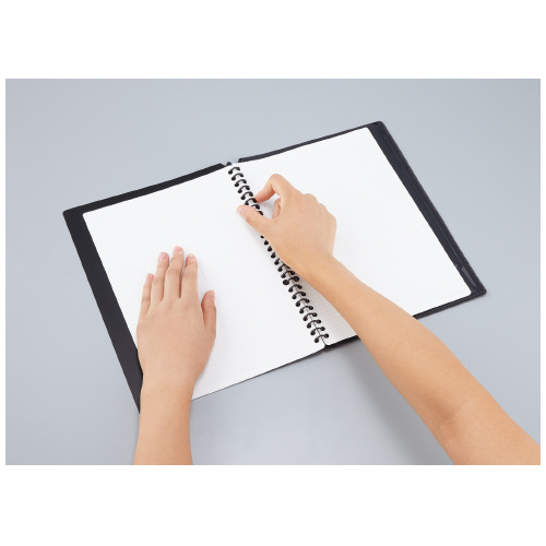 ●綴じ具が広く開き、ワンタッチで閉じることができるので中紙の差し替えもスムーズ。B5タテサイズ(26穴)のルーズリーフに対応。
