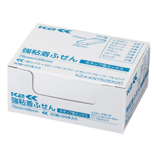 強粘着ふせんK2 75×25 20本 レギュラーサイズ(ネオン7色ミックス) K2メ-KN7525X20