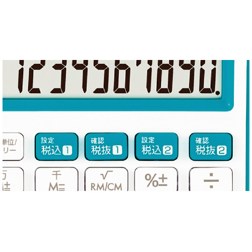 ●10桁 ●カラー/青 ●傾斜表示 ●サイズ/W106×D147×H25mm ●質量/116g(電池含む) ●すべり止め付き ●電源/太陽電池+リチウム電池(LR44) ●保証期間/1年 ●キー/プラスチック ●2種類の税計算 ●千万単位/メモリー計算切り替え機能 ●早打ち対応